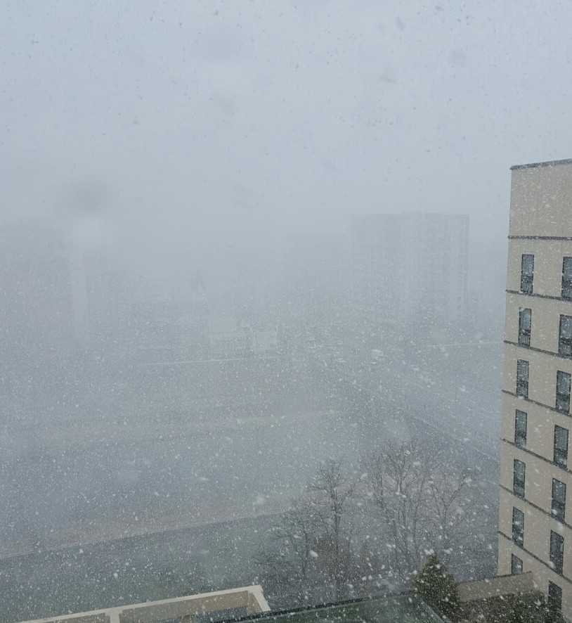 帰る日の朝は雪。ホテルのお部屋からシャッターを切りましたが、橋の上を走る車もヘッドライトをつけていたり、暗くて判別できにくい写真ですが、実際こういうふうに見えるのです。