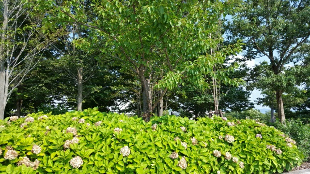 リハーサル前にちょっと周辺を探索。咲き終えたアジサイの植え込みの背後の木々の間から、蝉の鳴き声が聞こえました。