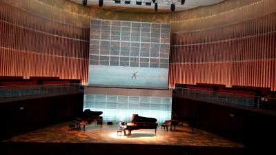ステージの奥のほうの曲線に沿ってピアノが斜めに配置されていることからも、ここが四角の床面ではないことが分かります。先ほど外観で円形の屋根を見たので、このホールの特徴があるとは思いましたが、こういう配置は初めてです。