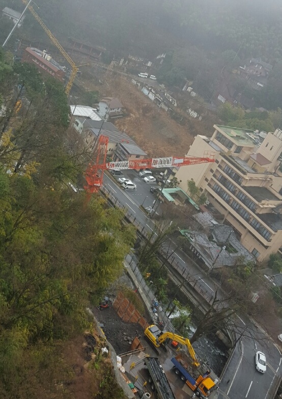 さて、実は湯河原のアトリエの近くで建設工事が進んでいて、現場では大勢の作業員の方々が働いています。ダボダボ姿の人も道を歩いていたりしています。今日は生憎の雨模様ですが、クレーンも見えますし、工事の音もかなり響いています。