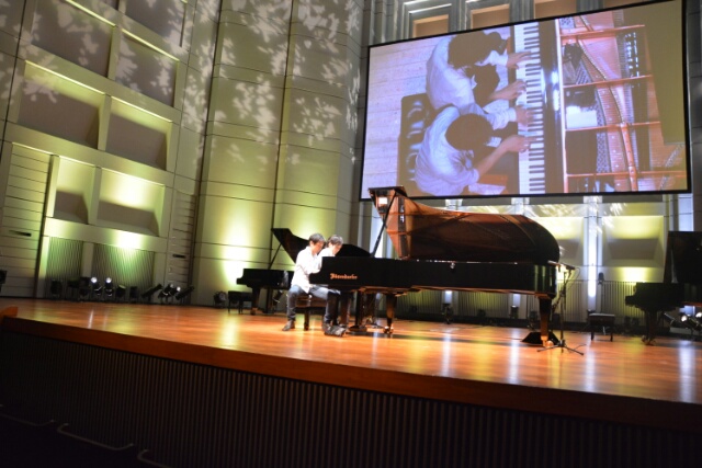 スクリーンが登場した「THE PIANIST」で、レ・フレールさんのコーナーは天井にもカメラを仕込んで、4手の交差する連弾の場面を映し出しています。普段の客席からは覗けないシーンですし、お二人ならではの技の聴かせどころです。