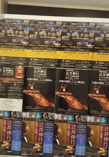 さあ今日のお客様をお迎えしよう・・・・とロビーに出てみましたら、「映像の世紀コンサート」と辻井伸行さんのコンサートチラシがびっしりと貼られているコーナーが見えました。ここでチケットも購入出来るのです。