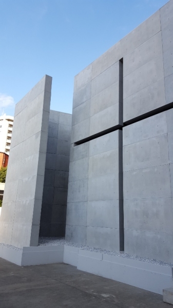 広い会場の殆どの展示は、これまでに発売されている安藤さんの本で知ったものです。今回のハイライトでもある、代表作「光の教会」が原寸大で野外展示場に再現されたものも、20年くらい前に大阪・茨木市の現地で教会内部に入った経験があるので、床材のことなどを思い出して懐かしかったですが、今回は建物を外から見ることが出来ました。するとコンクリートで囲った部分があることに気付きます。