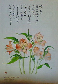 星野富弘さんは、24歳のとき体育教師として指導中の事故で首から下の運動機能を失い、絵や詩は筆を口にくわえて描く、のだそうです。もう熟年のお年頃かと思いますが、いつもふわっと心に届いてくる詩を書かれています。