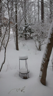 雪の軽井沢に滞在しています。通称アトリエの餌台にも、ケーキのように積もりました。大きな通りは除雪車が入りますが、雪道運転はやはりドキドキ。