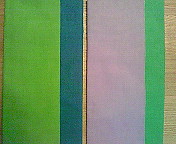 左側は「海中の岩に生える海藻、海松(ミル)の色を表したもの:海松色~みるいろ~」だそうで、冬もしくは四季通用。冬のかさねには、黄(き)と薄青(うすあお)を重ねた”枯野(かれの)”という、まさに風景を描けそうな言葉もありました。