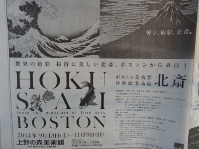 先週水曜日10日の朝日新聞を片付けようと、ふと文化の広告欄を見ると、ボストン美術館名品展として、上野の森美術館に「北斎」作品が来日!と書かれていてビックリ。11月9日まで開催だそうです。